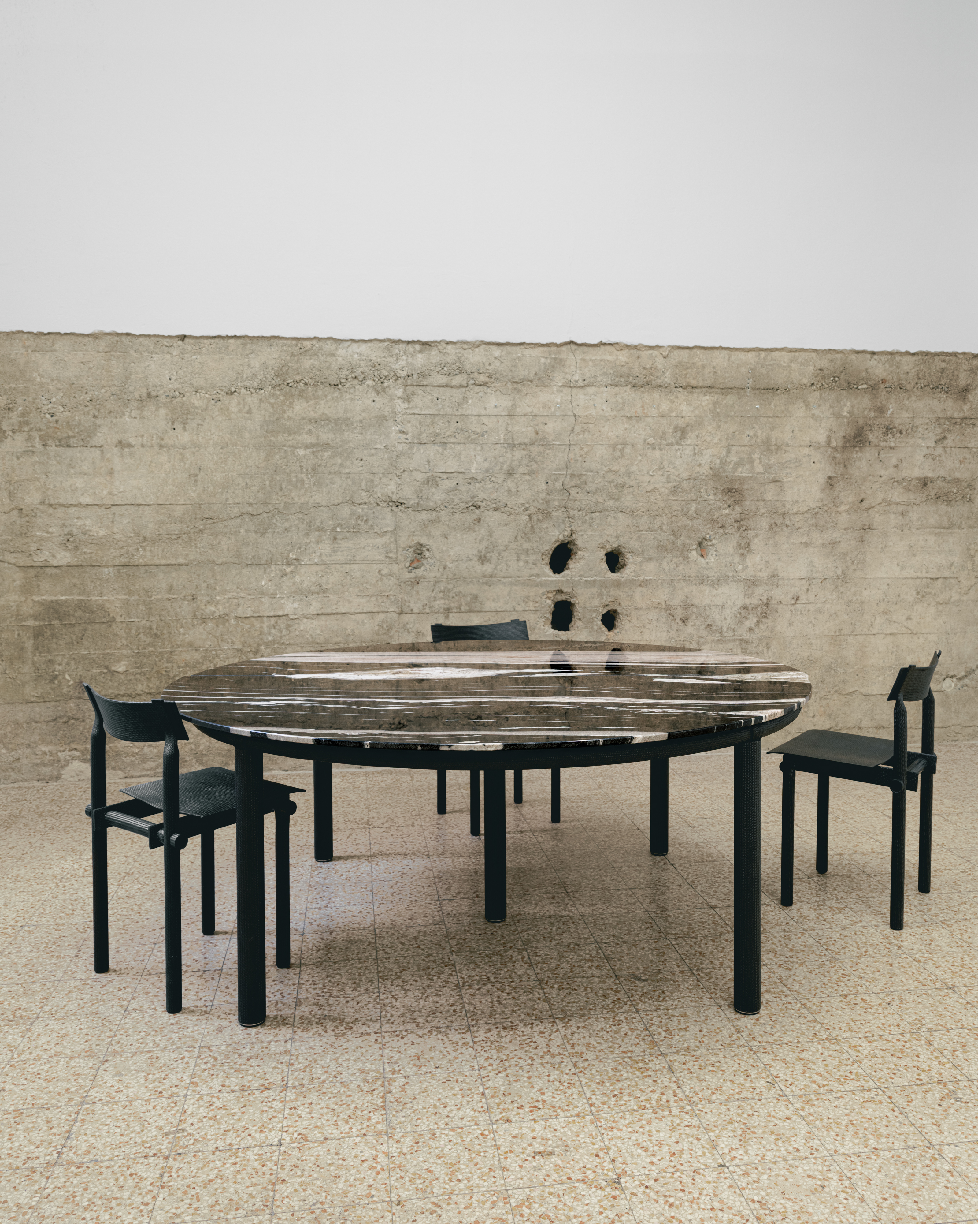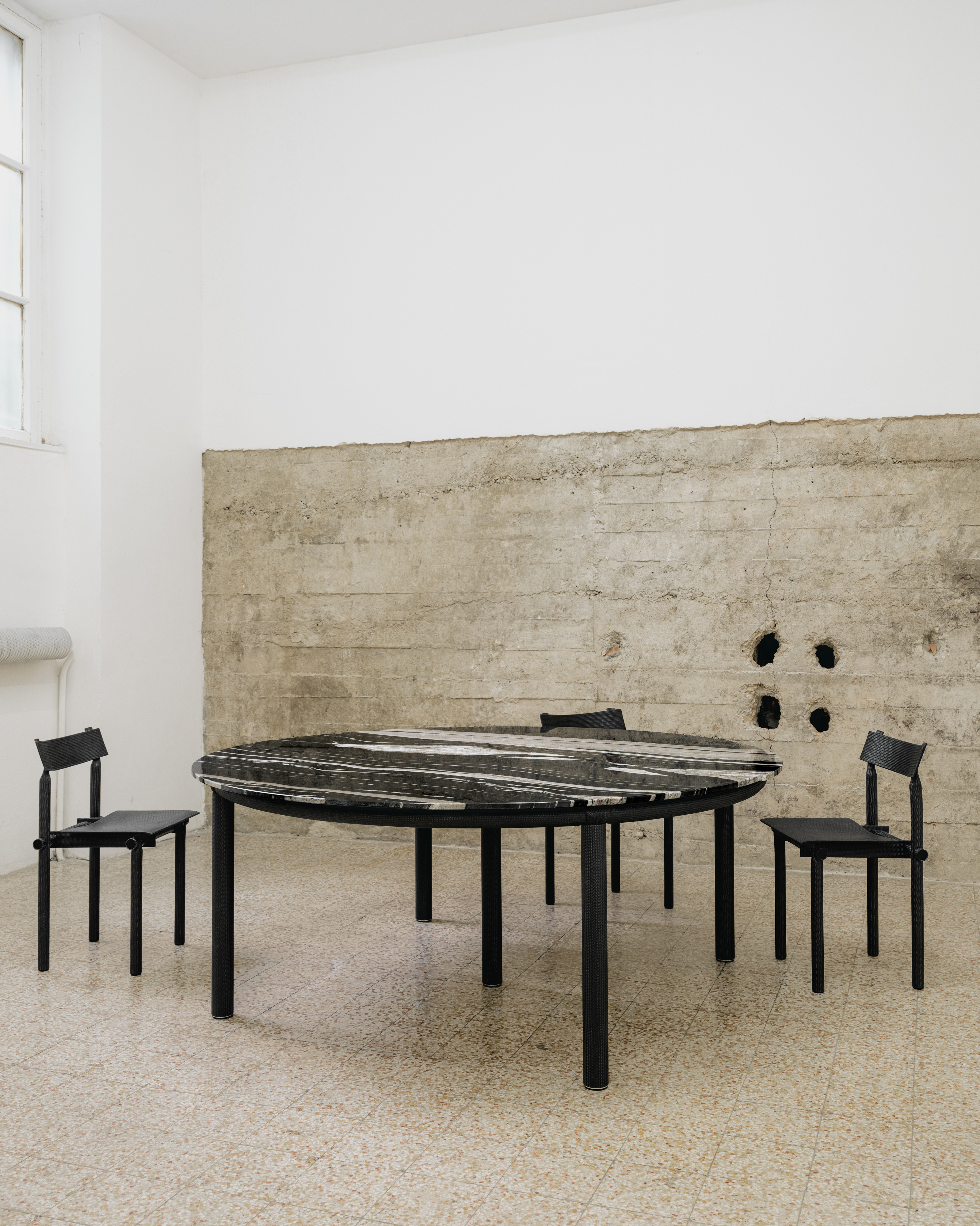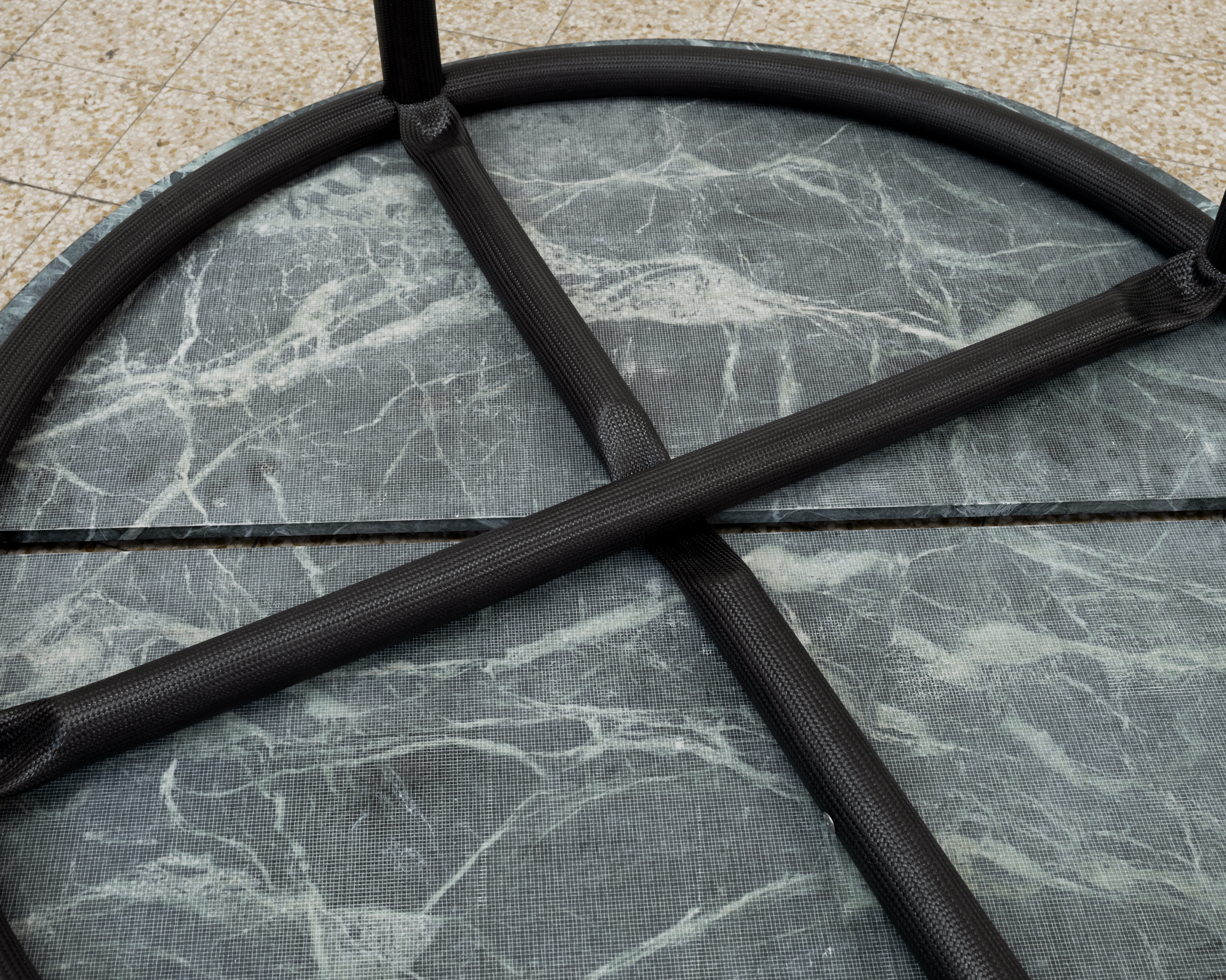 Presented for the first time in Italy, Muecke’s carbon tube objects are part of an open and evolving series consisting of both finite products and custom designs. The flexibility of the material as well as the precise assembly logics developed by Muecke has resulted in a principle-based design which can take multiple forms. For the the duration of Design Week, Zaza’ presents six items: 4 tubular chairs and two variants on a table design with table tops in Verde Antico and Copacabana marble.