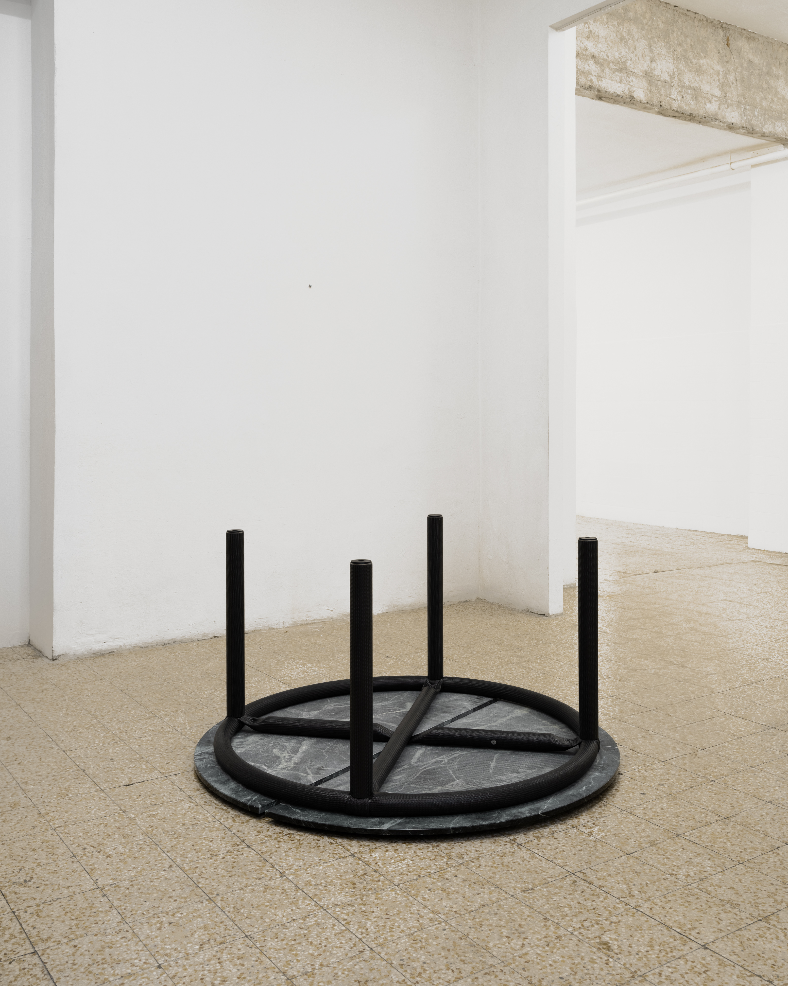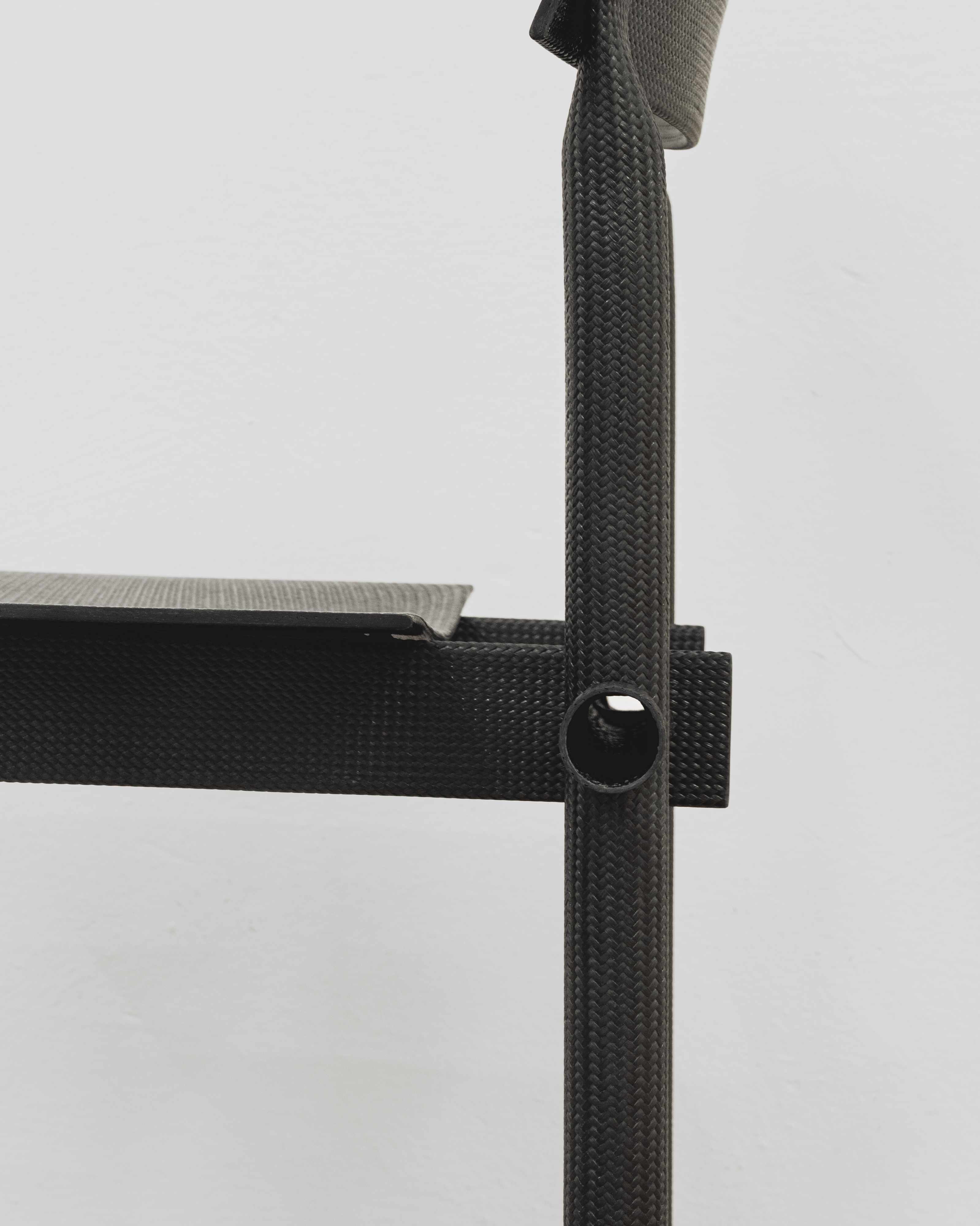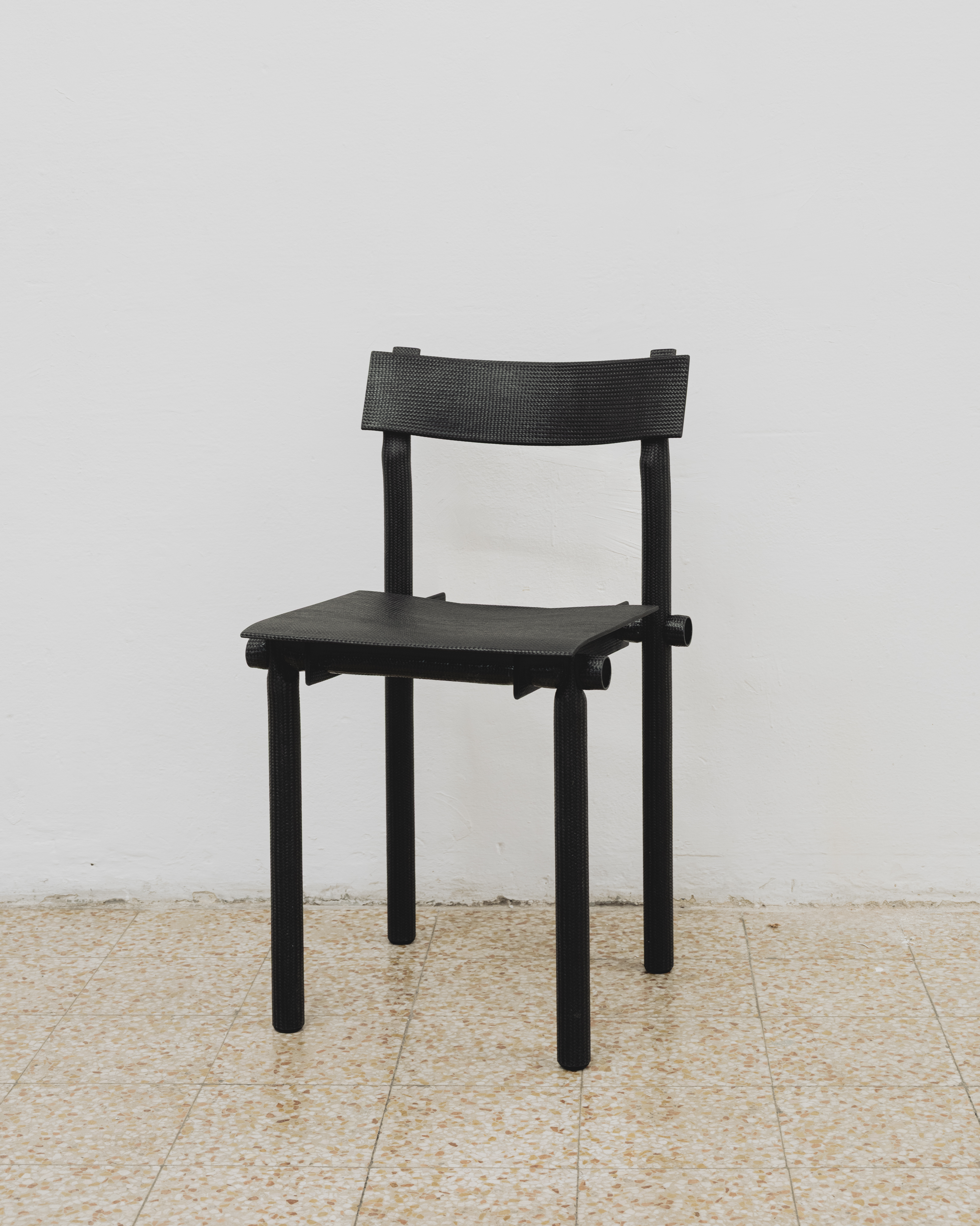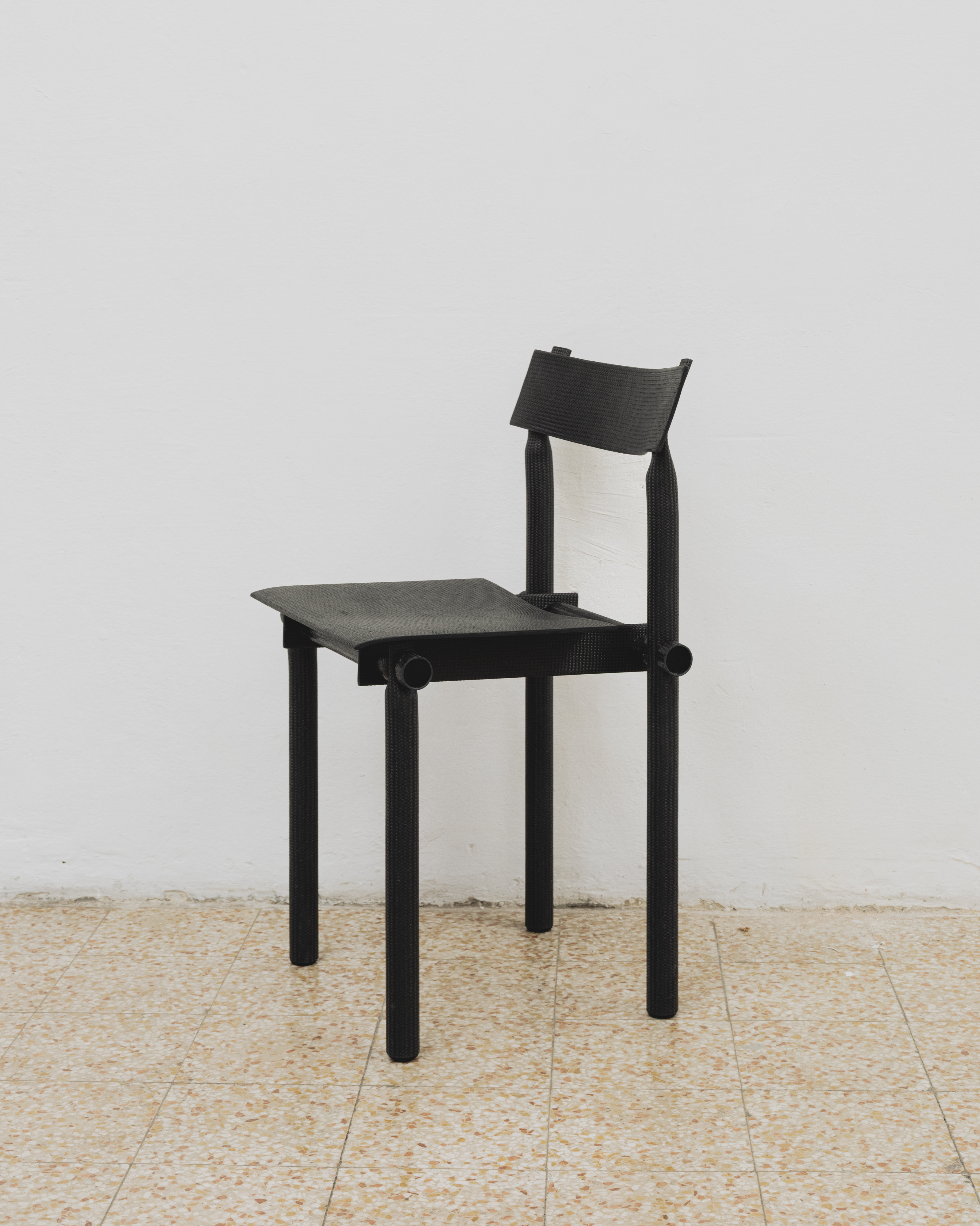 On occasion of Design Week 2025, Zaza’ presents an exhibition of American artist and designer Jonathan Muecke’s carbon fiber furnitures. Self-produced by Muecke through proprietary methods developed over the last years, the objects featured in the exhibition exemplify Muecke’s iterative approach to furniture-making. Alike other series by Muecke, they are the result of a methodical research in assembly logics, proportion and composition based on the aesthetic and technical possibilities of a single material which Muecke declines in diverse objects of common use such as chairs, benches or tables. The carbon fiber pieces presented at Zaza’ are built from a woven material with exceptional mechanical properties despite being practically weightless given its unique atomic composition. In the objects presented, the tubular and sheet elements used by Muecke are configured through a mixed range of joining techniques including slotting, casting, looping, pressing which confer a unique tectonic and aesthetic to the works.