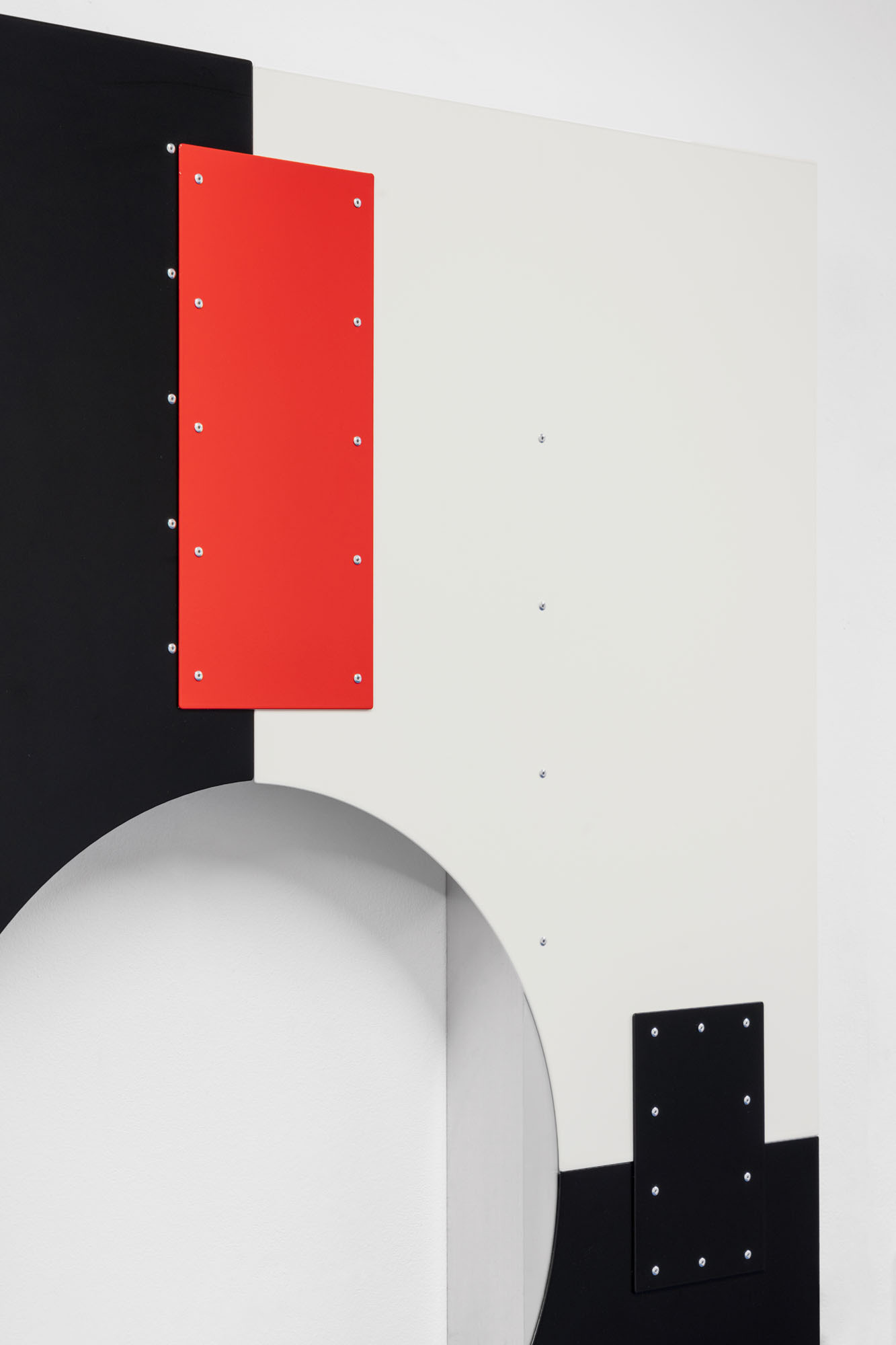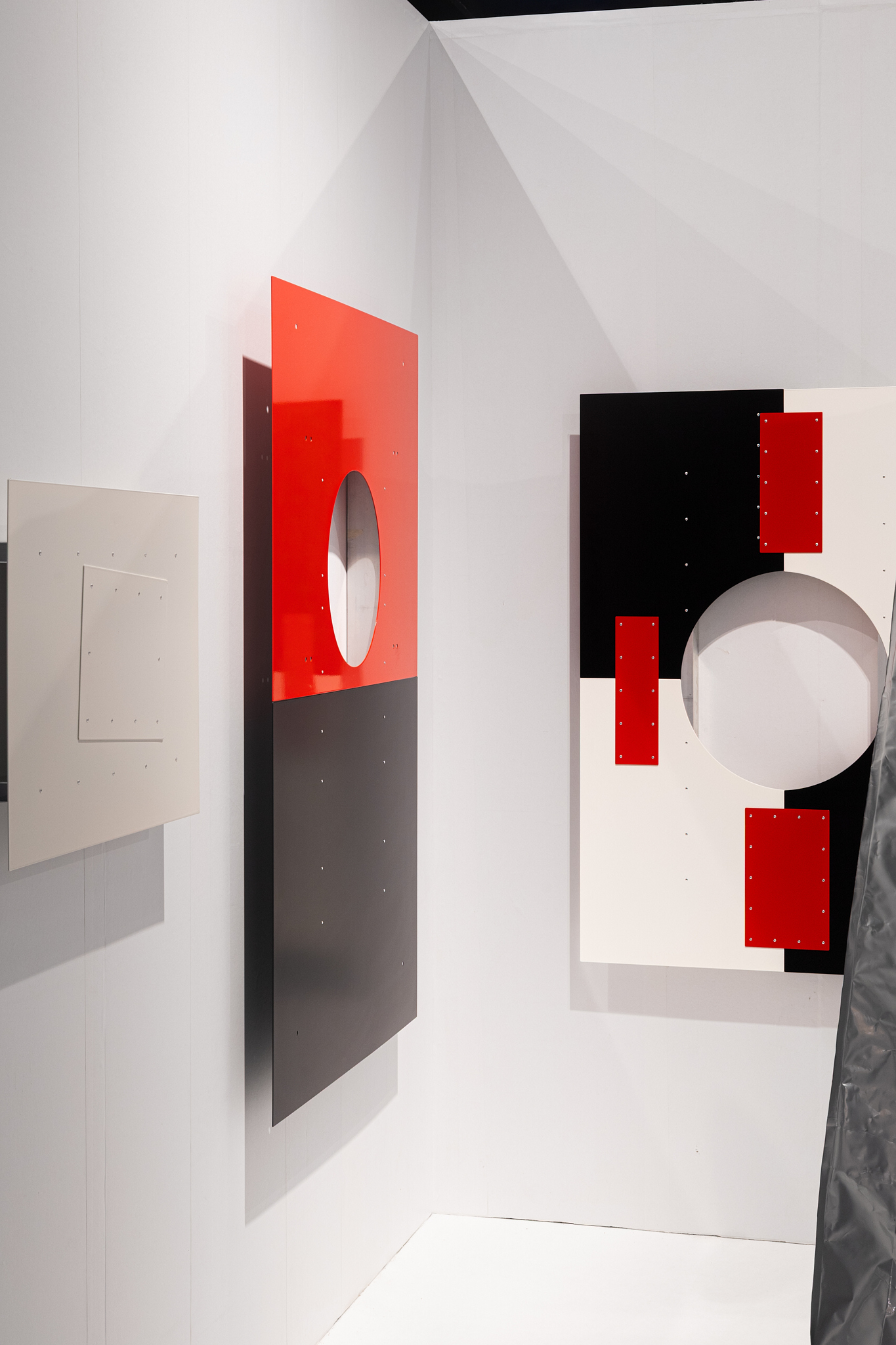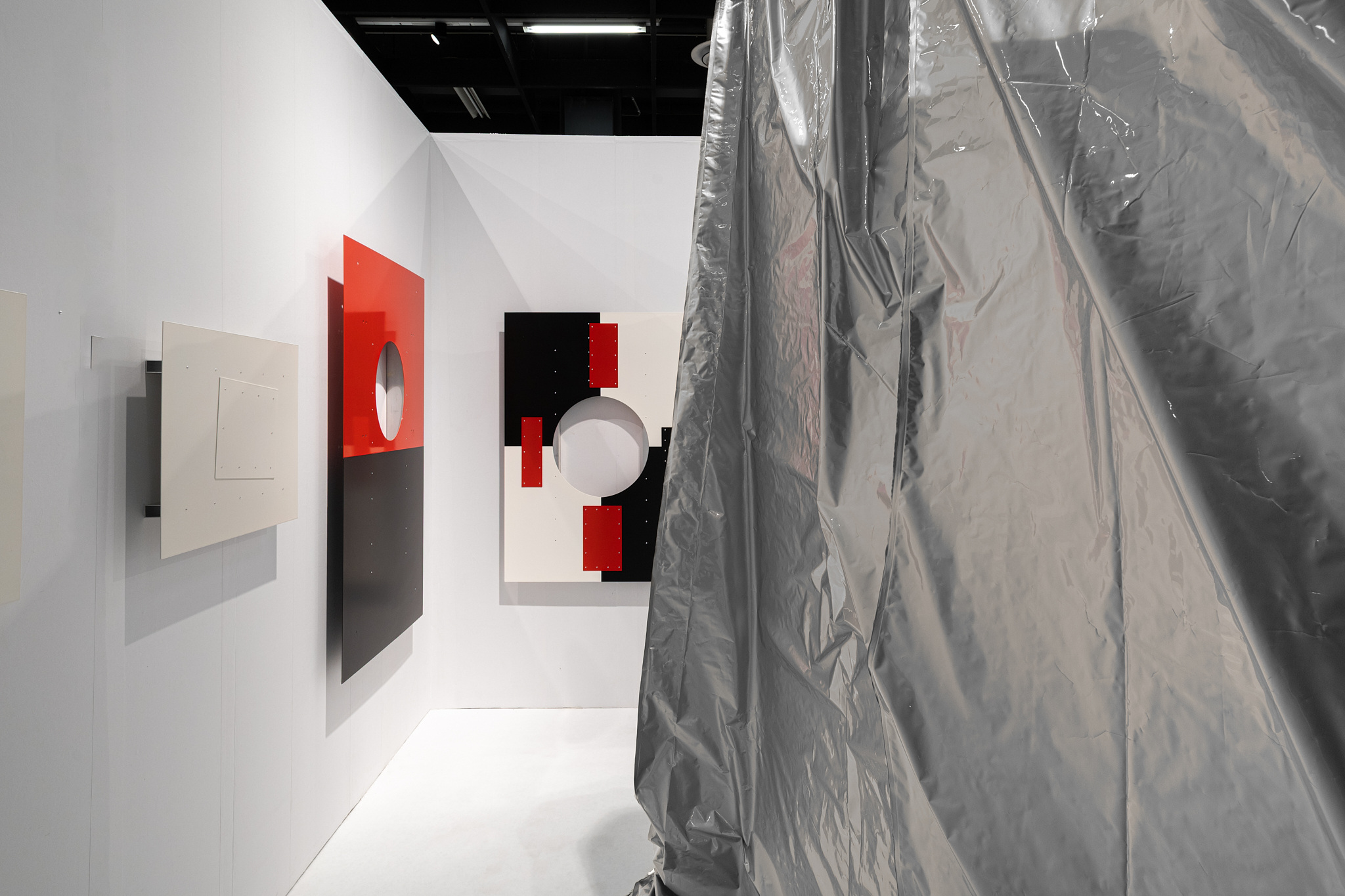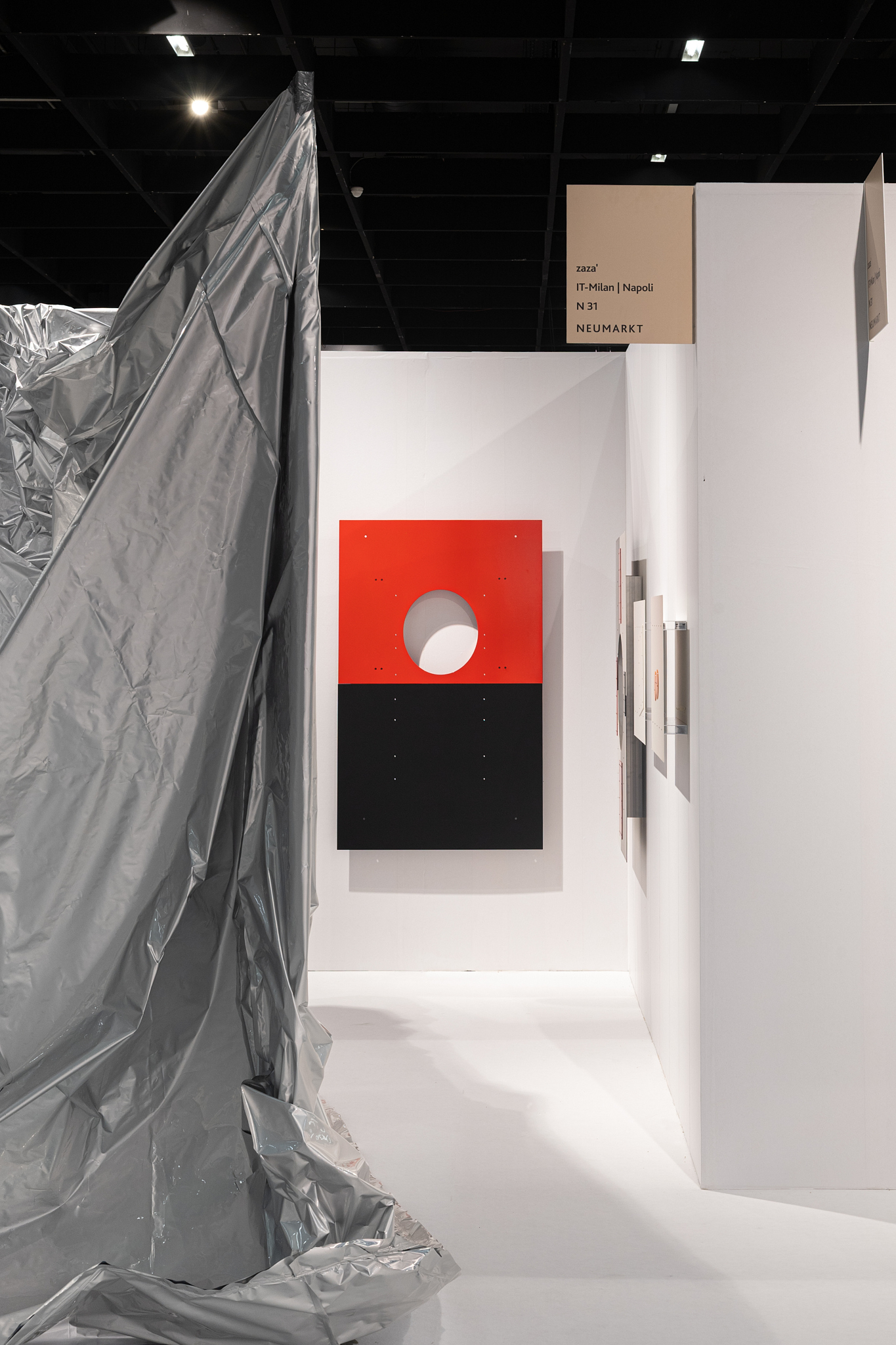 At Art Cologne 2025, zaza’ presents a collaborative project by Lydia Ourahmane and Sophia Al-Maria, alongside a new series of works by Emanuele Marcuccio. Al-Maria and Ourahmane’s ‘Grey Unpleasant Land’ is reimagined here as a spatial translation of their 2023 exhibition at Spike Island, Bristol. Extending their sculptural system to the scale of the fair booth, the artists treat its architecture — partitions, lighting, circulation — as both form and ideology. If the original project traced the psychic residue of Britishness, this iteration exposes the infrastructural residue of the art fair itself: an apparatus in which economies of value and gaze coincide. The system operates as a diagnostic tool, articulating a passage from the residues of empire to the protocols of display, where affect becomes infrastructure and critique becomes form. By inhabiting rather than illustrating the mechanisms of exchange, Al-Maria and Ourahmane turn the booth into a live critique of visibility, provenance, and cultural capital. Emanuele Marcuccio’s new series unfolds from a negotiation between authorship, production, and biography. Working with powder-coated metal panels and riveted geometries fabricated in the Veneto region — an area economically intertwined with the greater Rhine industrial corridor — Marcuccio transforms the anonymous language of fabrication into a medium of irony and self-reflection. His minimalist vocabulary, at once detached and vulnerable, reconsiders the gendered heroics of historical minimalism: the muscular “cowboy sanctity” of the 1960s reconfigured through a deliberate anti-virtuosity. Marcuccio’s works hover between homage and subversion. He frequently replays the gestures of other artists, fusing sincerity and parody, while allowing figuration to appear only as a hesitant undercurrent within abstraction. Through this restrained irony, his practice exposes the intersection of class, labour, and identity — turning the surface itself into a site of critique.