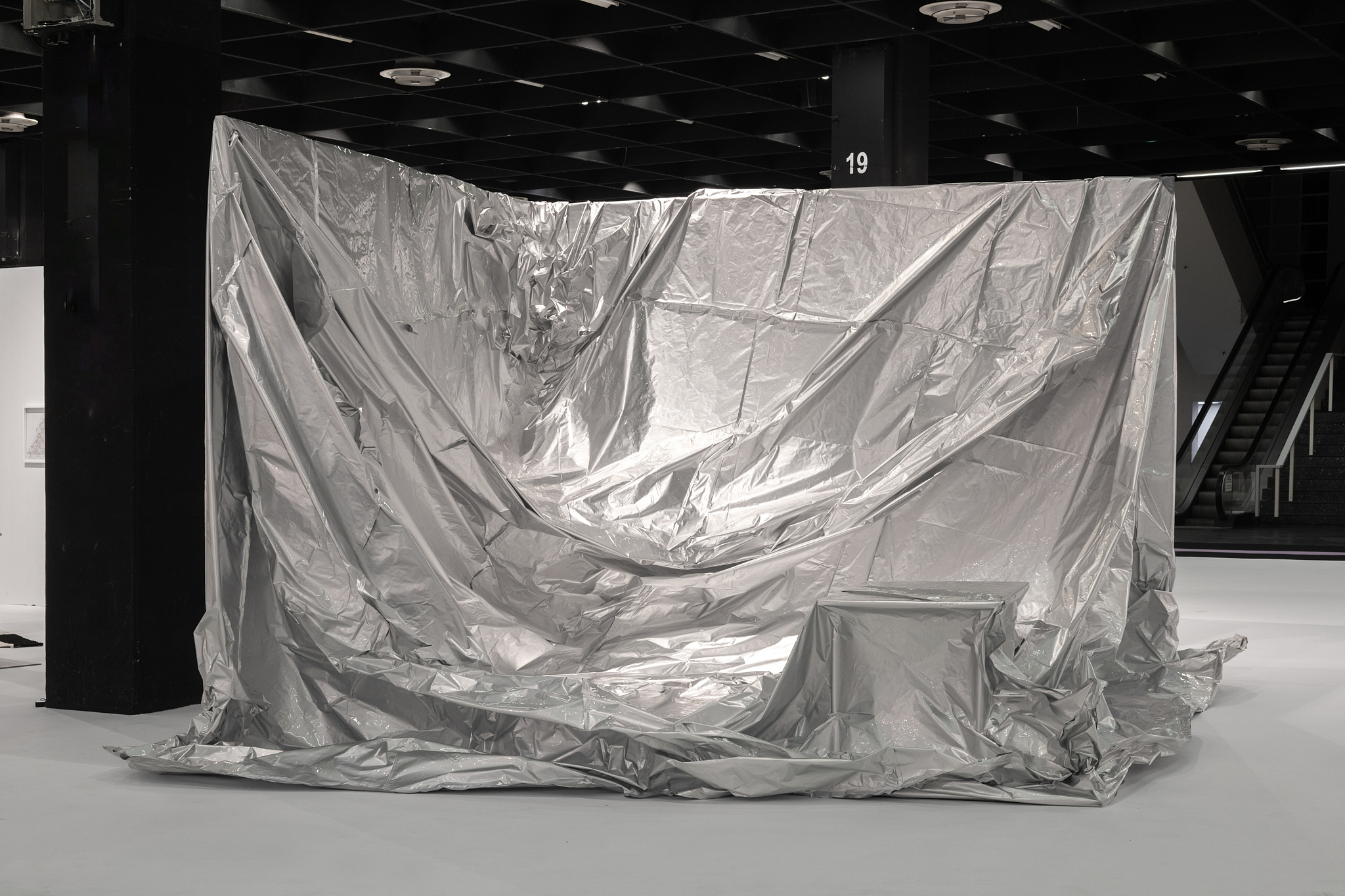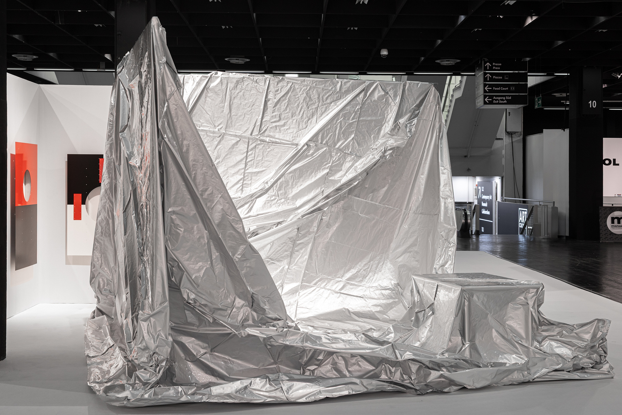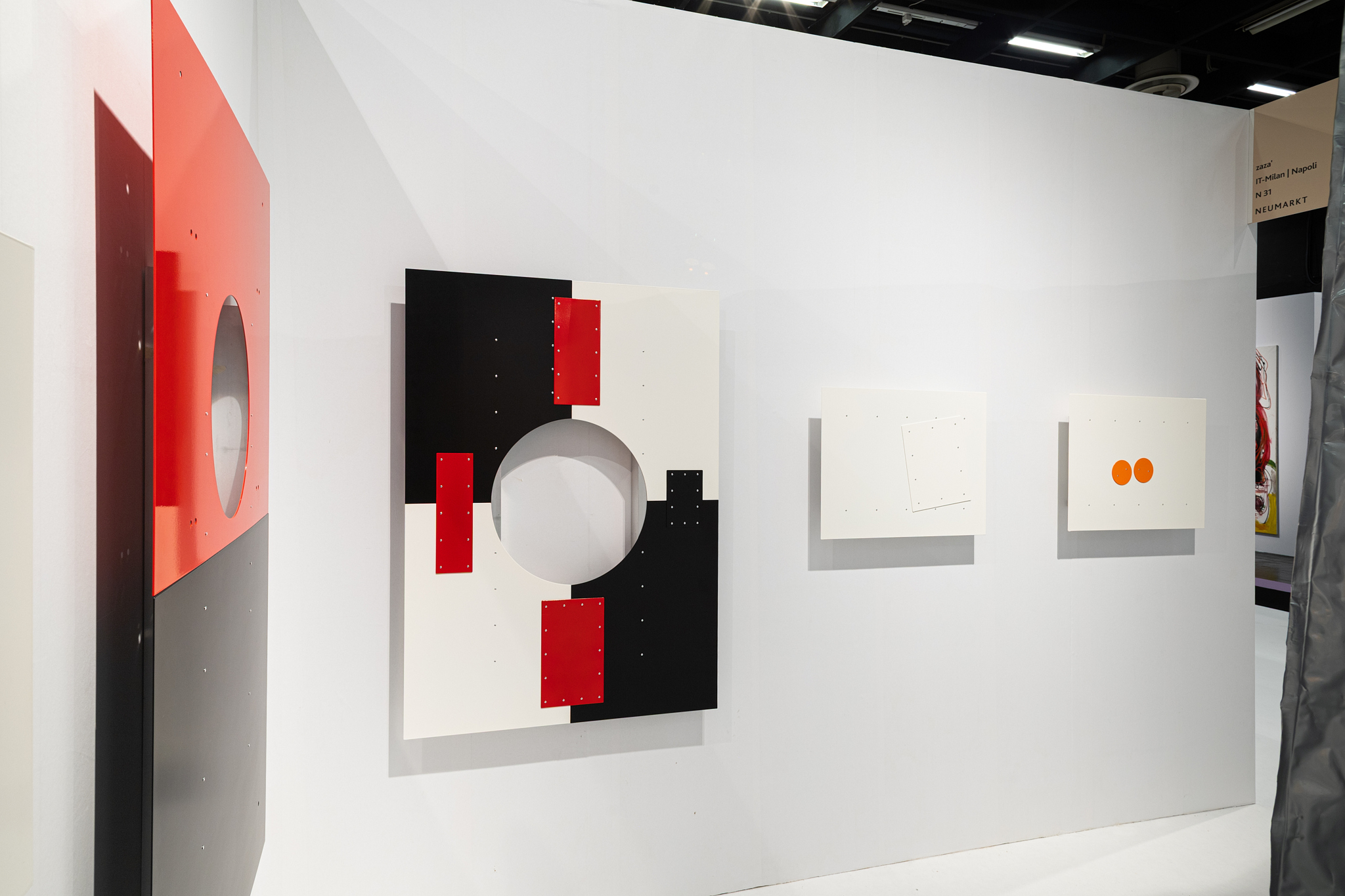 At Art Cologne 2025, zaza’ presents a collaborative project by Lydia Ourahmane and Sophia Al-Maria, alongside a new series of works by Emanuele Marcuccio. Al-Maria and Ourahmane’s ‘Grey Unpleasant Land’ is reimagined here as a spatial translation of their 2023 exhibition at Spike Island, Bristol. Extending their sculptural system to the scale of the fair booth, the artists treat its architecture — partitions, lighting, circulation — as both form and ideology. If the original project traced the psychic residue of Britishness, this iteration exposes the infrastructural residue of the art fair itself: an apparatus in which economies of value and gaze coincide. The system operates as a diagnostic tool, articulating a passage from the residues of empire to the protocols of display, where affect becomes infrastructure and critique becomes form. By inhabiting rather than illustrating the mechanisms of exchange, Al-Maria and Ourahmane turn the booth into a live critique of visibility, provenance, and cultural capital. Emanuele Marcuccio’s new series unfolds from a negotiation between authorship, production, and biography. Working with powder-coated metal panels and riveted geometries fabricated in the Veneto region — an area economically intertwined with the greater Rhine industrial corridor — Marcuccio transforms the anonymous language of fabrication into a medium of irony and self-reflection. His minimalist vocabulary, at once detached and vulnerable, reconsiders the gendered heroics of historical minimalism: the muscular “cowboy sanctity” of the 1960s reconfigured through a deliberate anti-virtuosity. Marcuccio’s works hover between homage and subversion. He frequently replays the gestures of other artists, fusing sincerity and parody, while allowing figuration to appear only as a hesitant undercurrent within abstraction. Through this restrained irony, his practice exposes the intersection of class, labour, and identity — turning the surface itself into a site of critique.