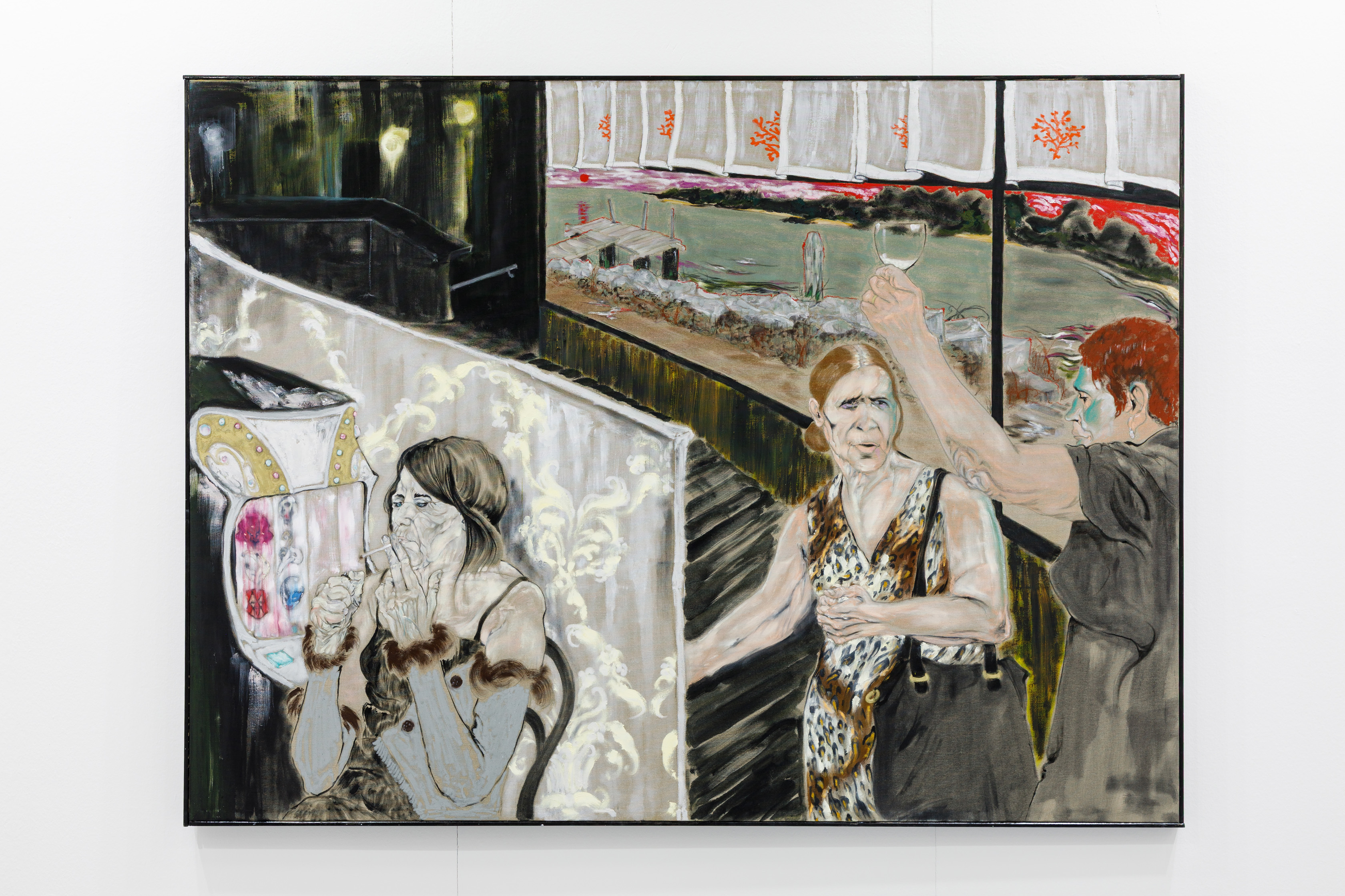Grounded in a deep attention to painting as a historical and material practice, Serpani’s work also resonates with early twentieth-century literary traditions that examined the opaque side of modernity—its micro dynamics, moral ambiguities, and everyday tragic register. In this sense, certain pictorial references surface obliquely: a sensitivity to the ordinary and to the absorption of figures into space that recalls, without ever becoming citation, the intimism of Édouard Vuillard. Here, as there, environment and subjectivity tend to merge, and the social scene is constructed through colour, surface, and expressive tension.
