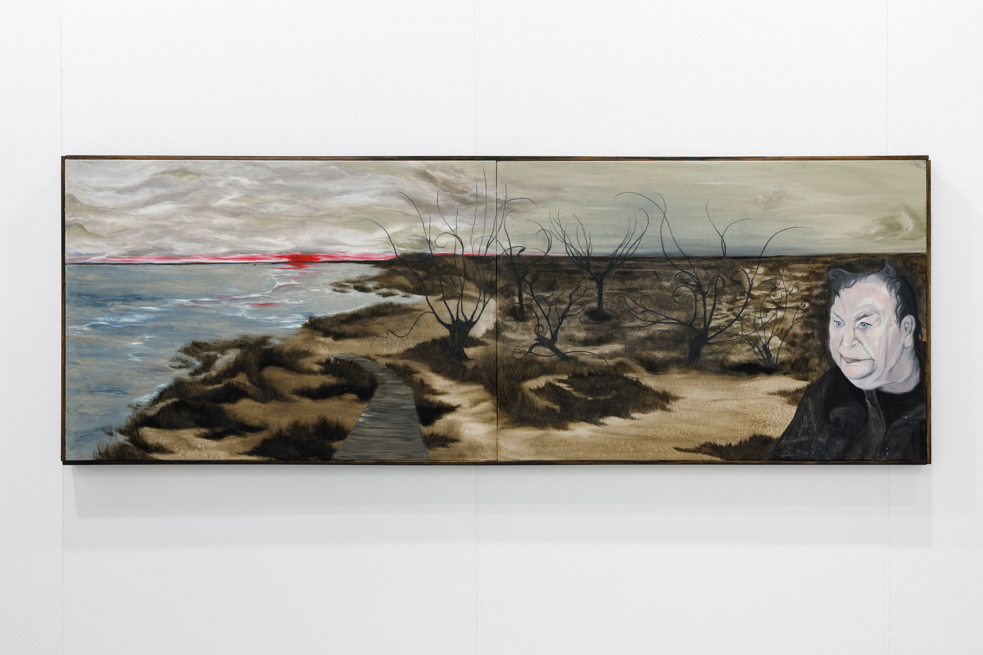 This gaze carries an implicitly sociological dimension. In one painting, a woman standing alone in front of a slot machine is rendered through the unexpected use of golden paint, at once seductive and faintly disturbing. Serpani does not shy away from excess: acidic colours, kitsch tonalities, and metallic pigments coexist with muted, somber passages. These chromatic dissonances become tools for registering the contradictions of contemporaneity, where desire, consumption, and stasis intertwine without resolution.